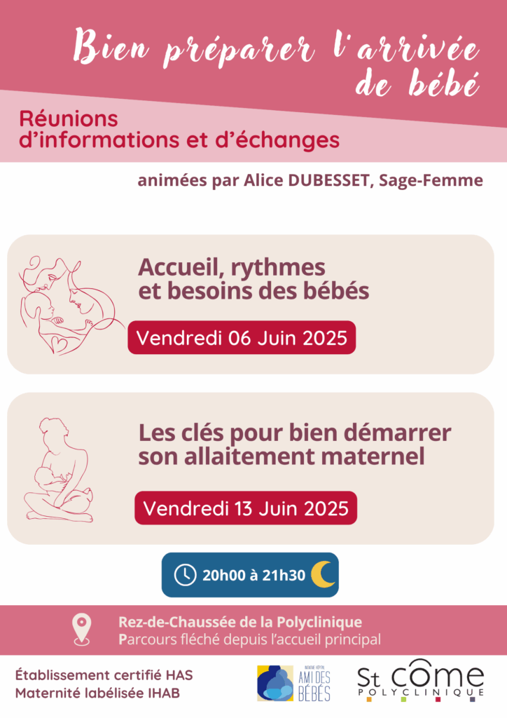 🤰La Maternité de la Polyclinique Saint Côme vous propose un temps d’échange entre futurs parents et en petit groupe animée par Alice DUBESSET, Sage-femme.